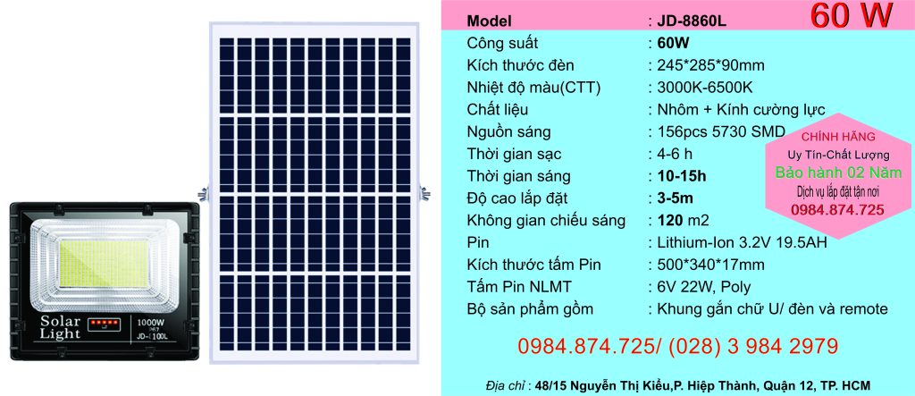 Đèn năng lượng mặt trời của Jindian model series JD-8xxxL(60W~300W) là sản phẩm công suất chiếu sáng rất cao với khả năng chống nước theo tiêu chuẩn khắt khe IP67 cao nhất. Tích hợp (156~696) bóng LED cao cấp SMD:5730 với tuổi thọ cao và khả năng chiếu sáng hoàn hảo, bộ đèn có dung lượng pin lưu trữ lớn(19.5Ah~40Ah) có thể chiếu sáng liên tục trong (10h~15h) với thời gian xạc chủ từ (4h-6h), sản phẩm có tuổi thọ lên tới 15 năm. Diện tích chiếu sáng rộng lên tới (120m2~300m2). Cấu trúc nâng cấp với bộ vỏ nhôm tản nhiệt nguyên khối có các rảnh tản nhiệt sâu và thẩm mỹ đạt hiệu quả cao hơn rất nhiều so với các loại đèn năng lượng khác có trên thị trường.